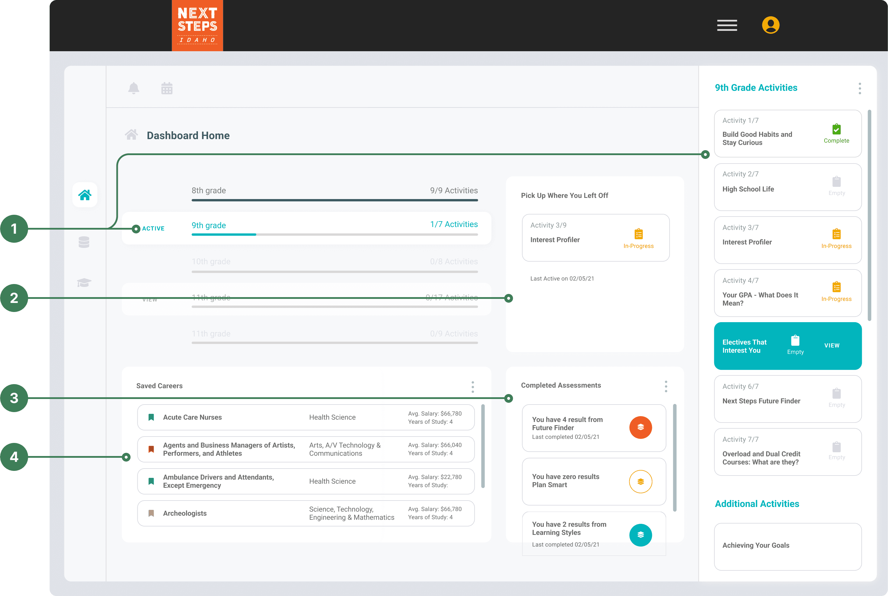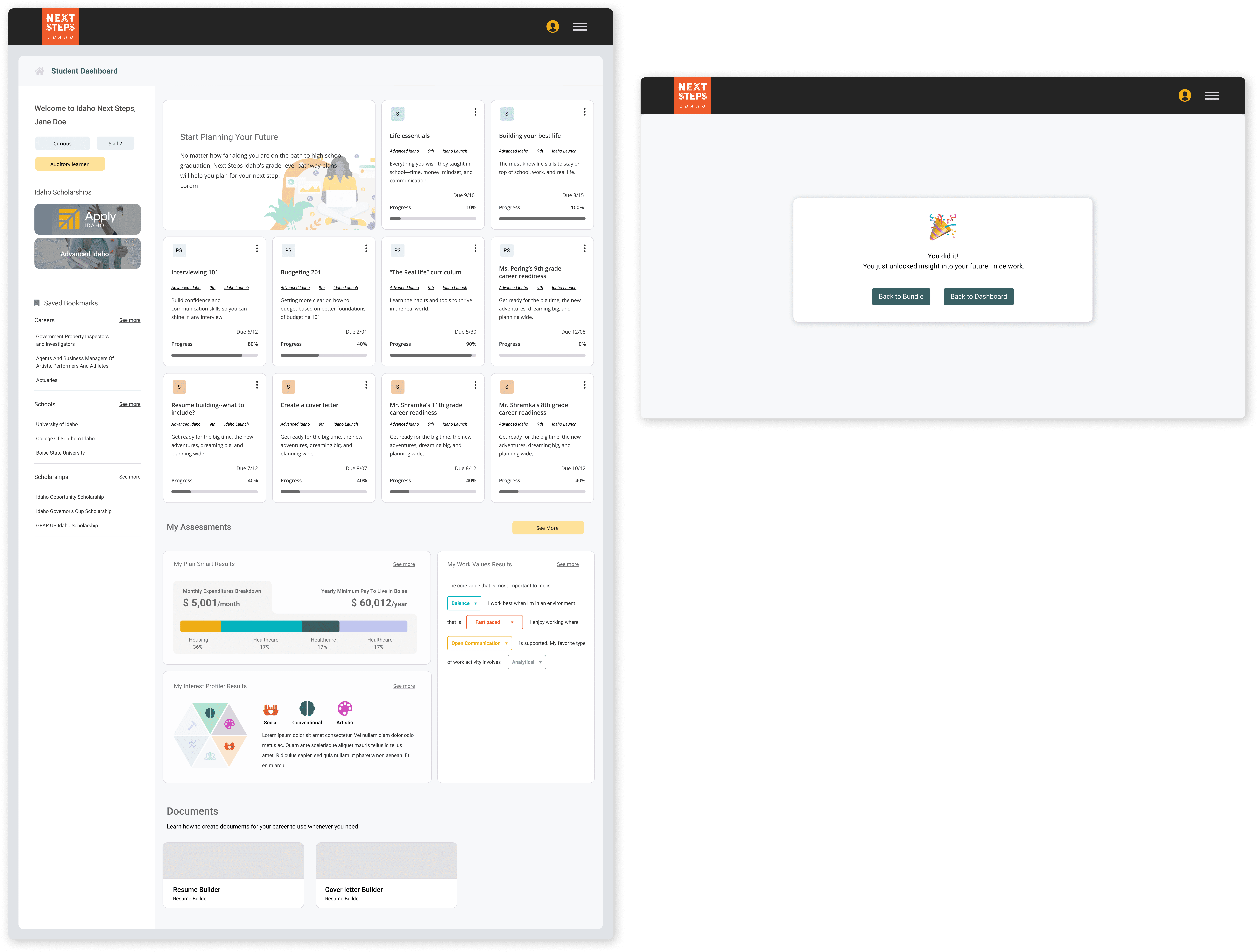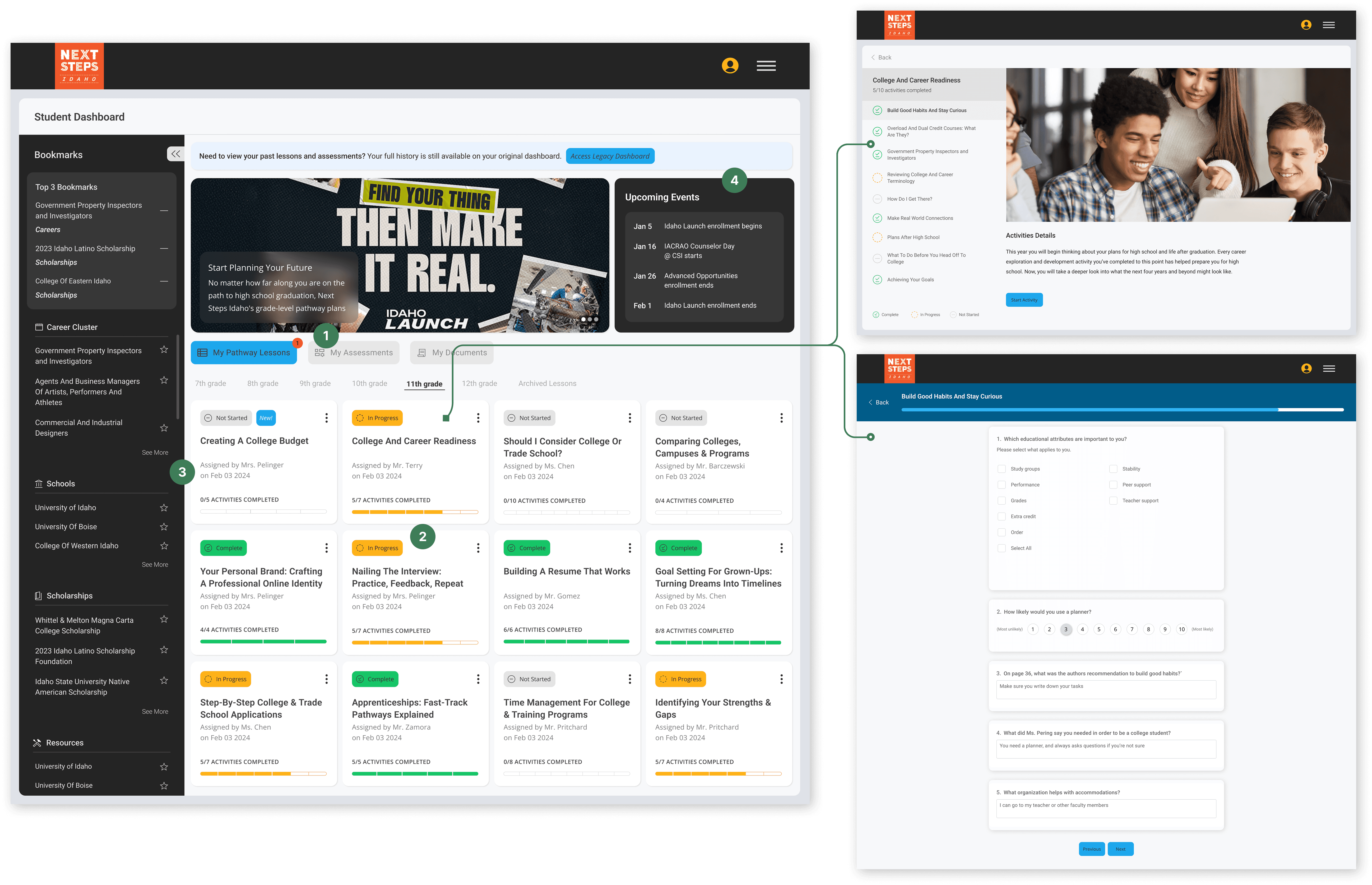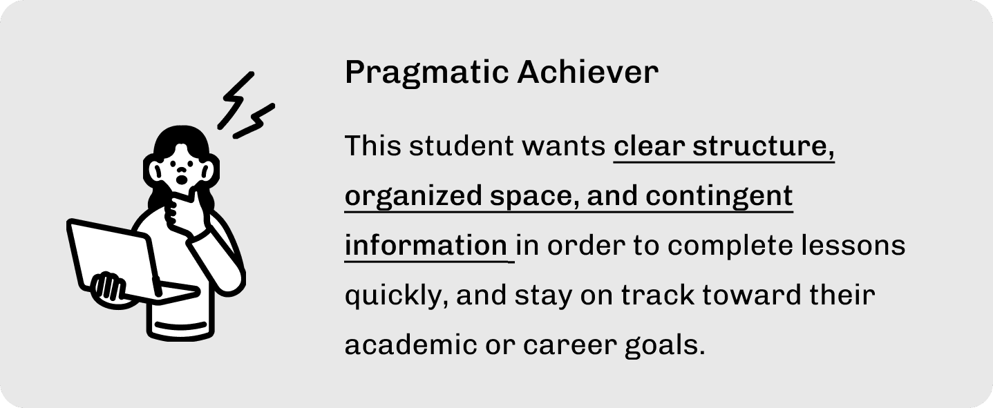 This usage coincided with students rushing to complete modules for financial aid requirements. Even Next Steps Idaho’s Head Admin noted students weren’t taking time to explore the dashboard. Combined with its lack of visual cohesion, this made it clear the design needed greater clarity, and faster access.