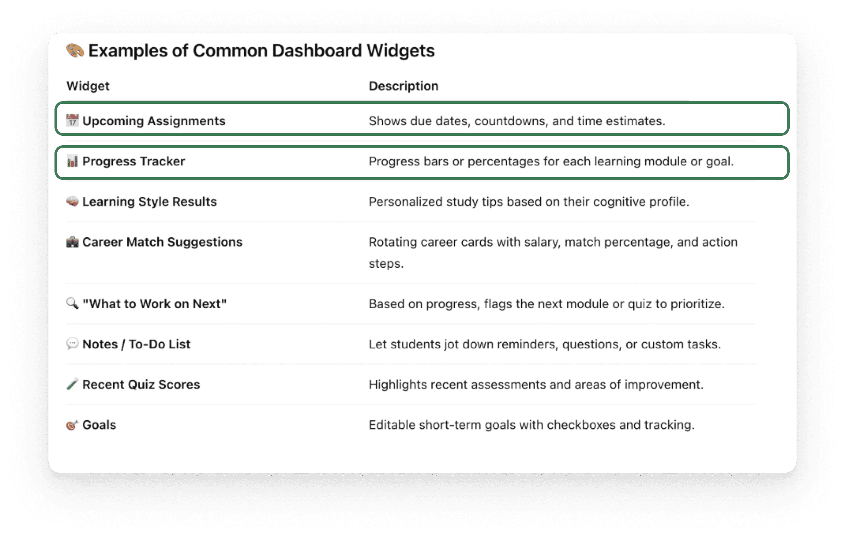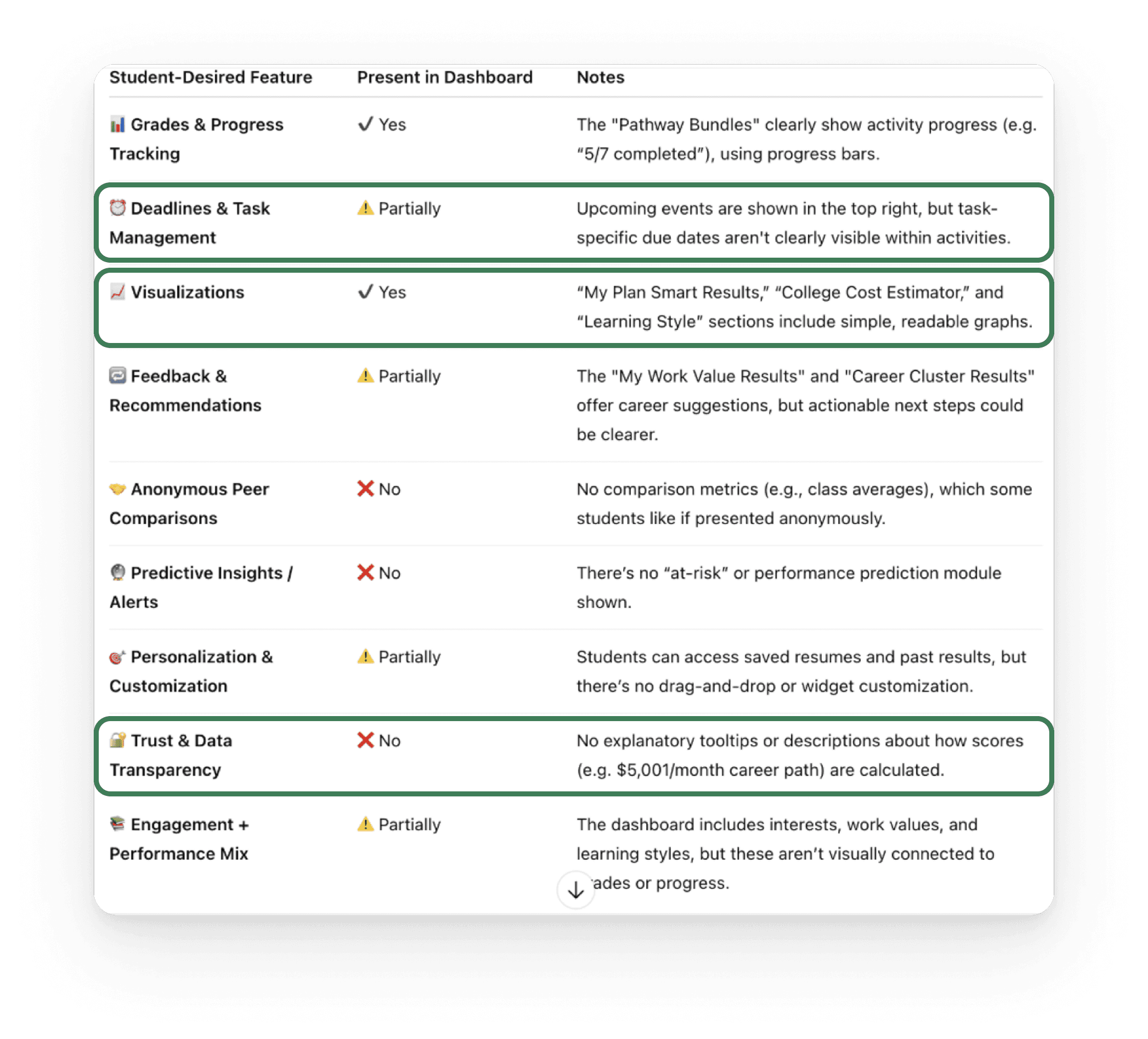 Features pulled from academic research states students would benefit from generous visuals that helped remind students of assignments, due dates and , track progress that was are helpful signifiers and motivators/gamification.