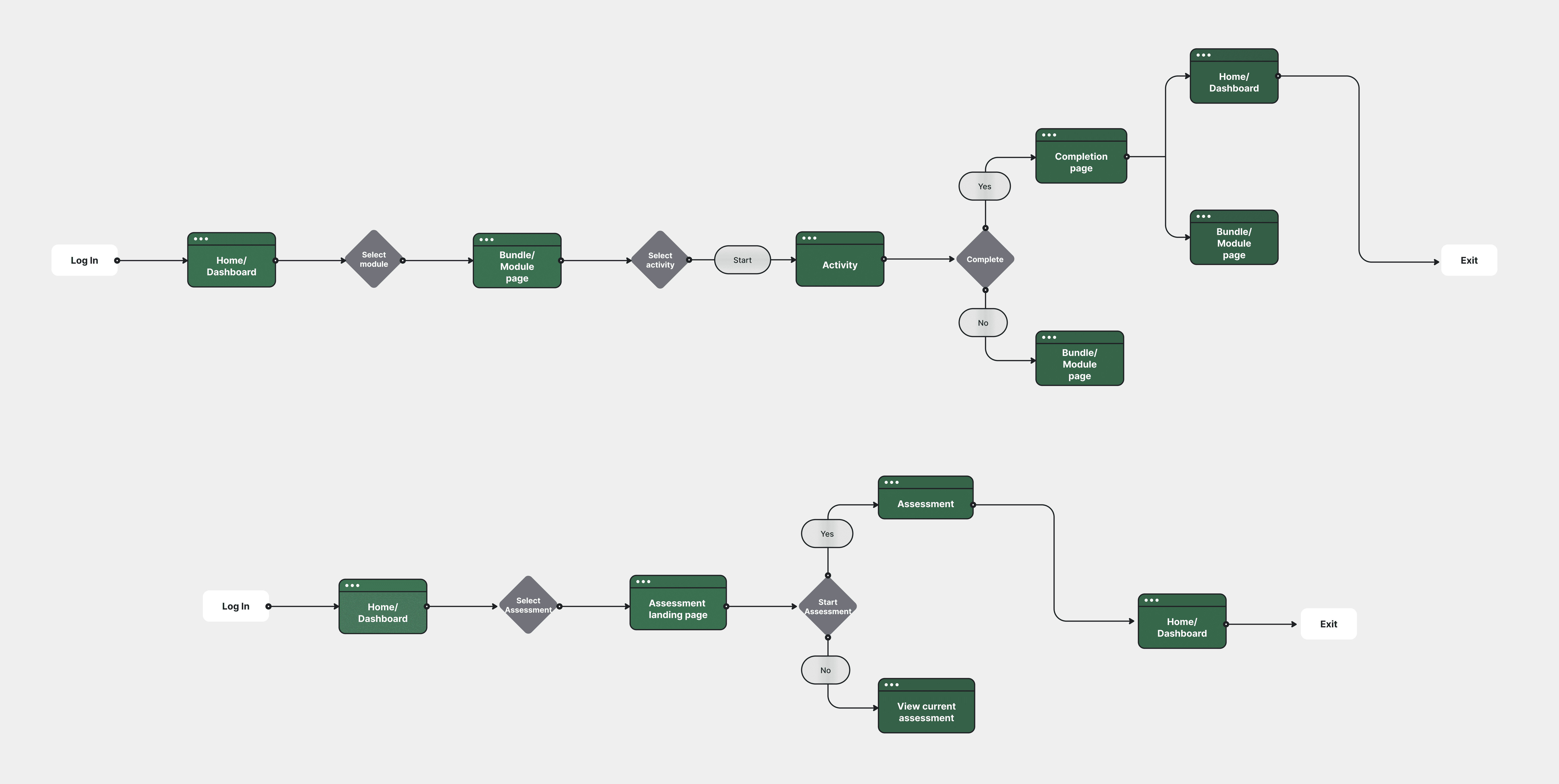 Before designing, I created user flows for lessons and assessments to brainstorm where features, information and content should be.